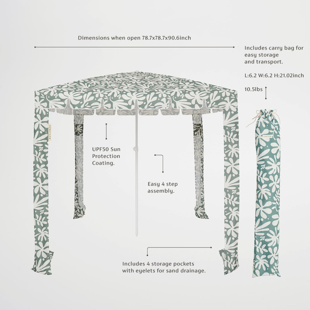 The Beach Cabana includes UPF50 sun protection with a ventilated roof and sturdy sand-footed legs. Packs into a drawstring carry bag and sets up easily with a one-adult umbrella-style mechanism.