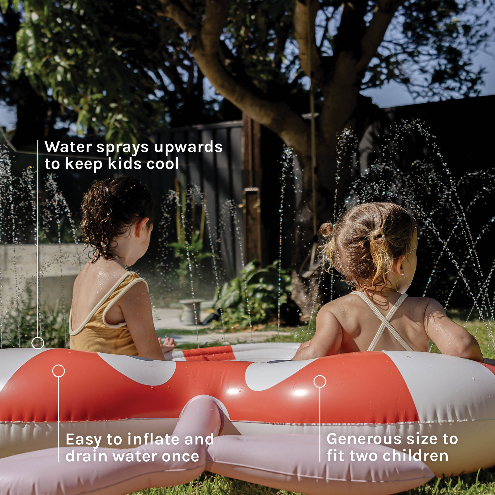 Perfect for kids that are just starting to build water confidence and enjoy splish-splashing their hands and feet. Simply attach to your garden hose and play above the sun shower of water spraying from all sides.
