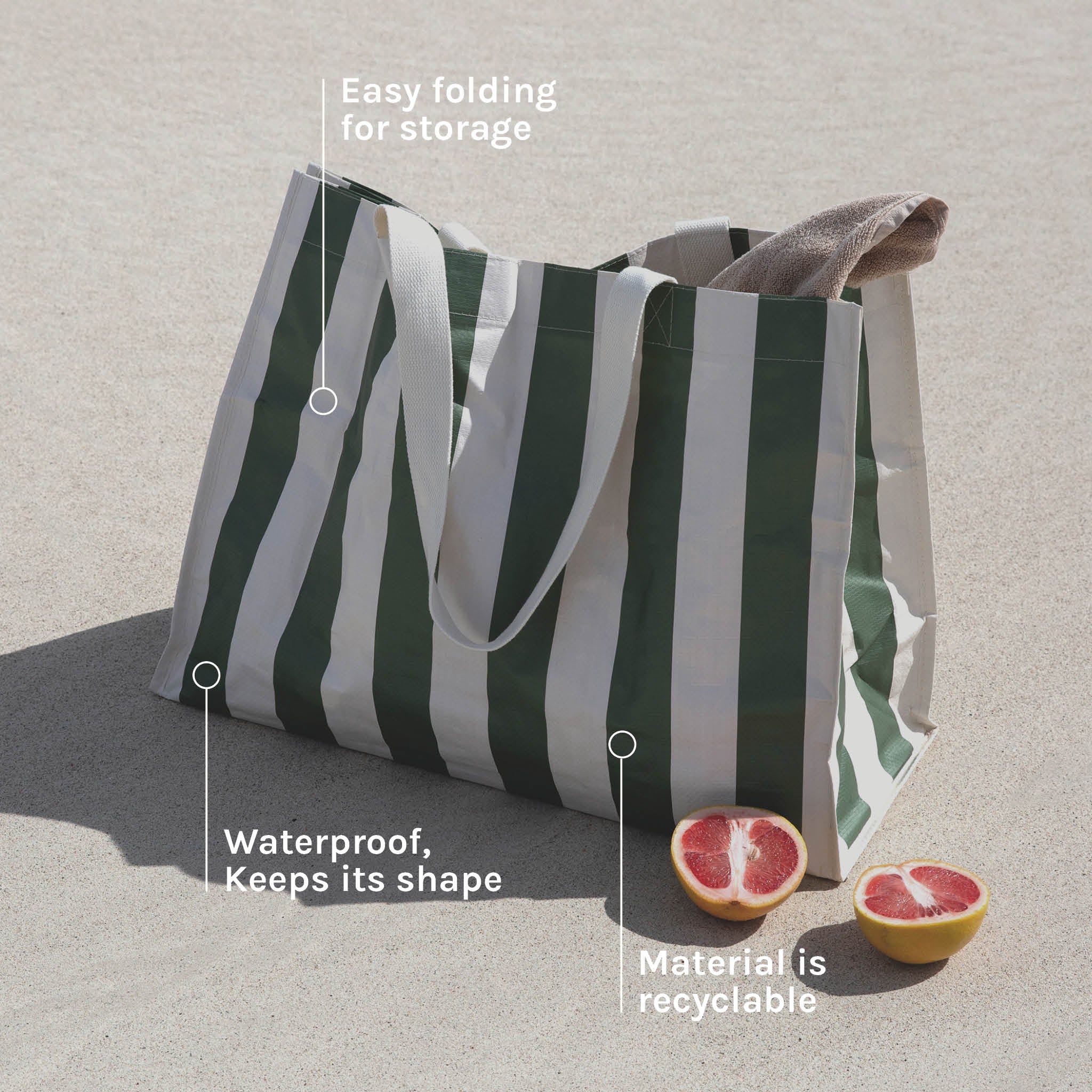 Pack your paradise in the ultimate everyday essential. The Vacay Olive Carryall Beach Bag is oversized and stylish, designed for any occasion. Featuring over the shoulder carry straps, a detachable zipped pouch, and drainage holes for sand and water to escape, you won’t want to leave home without this tote. Pick up and go with its warm olive and cream maxi stripe print that will have you whisked away to island paradise.