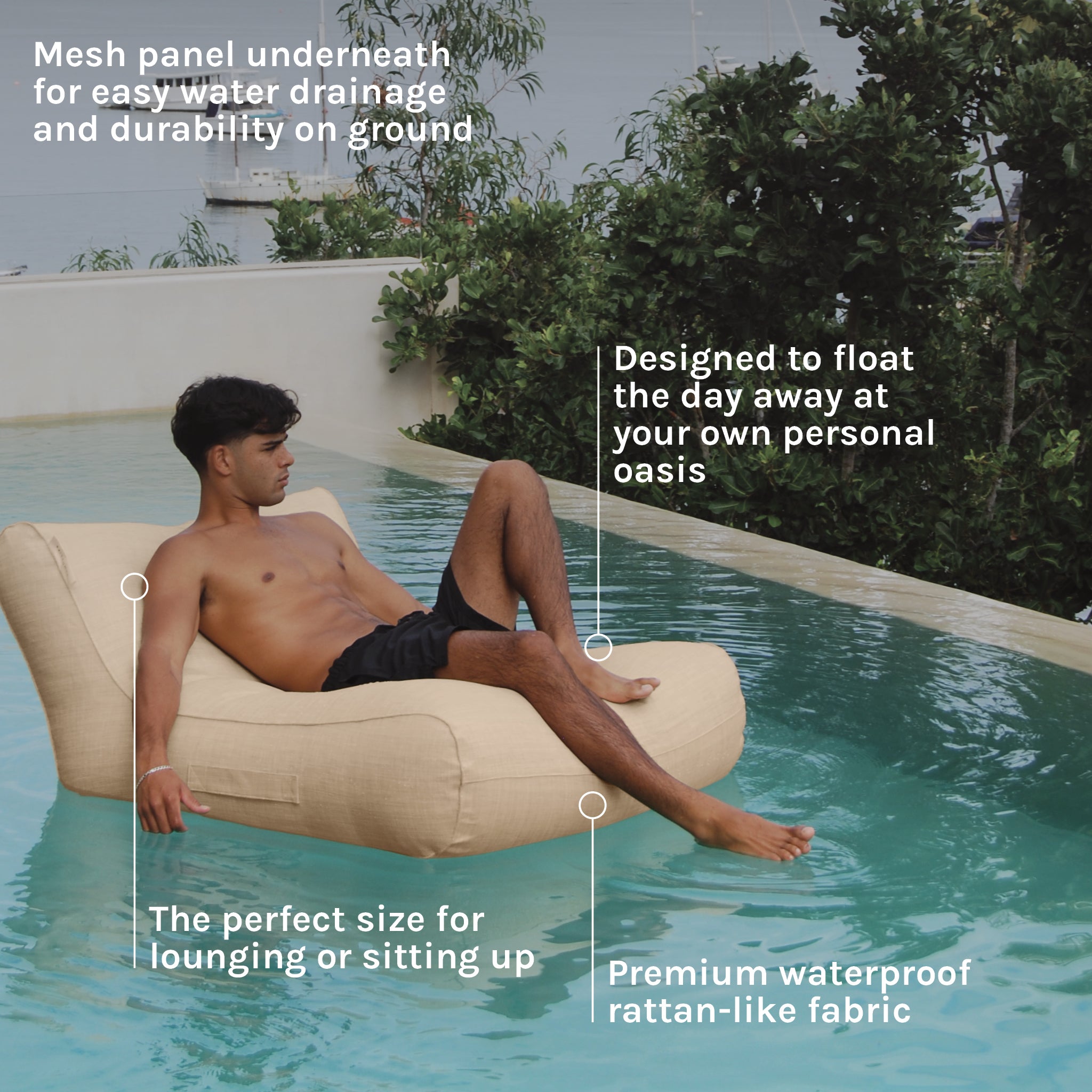 Crafted from a premium rattan-style woven fabric, this floating chair delivers effortless resort vibes whether you're drifting on the water or lounging on land. Its comfortable sit-up design and supportive shape make it ideal for unwinding, while the mesh underside provides quick drainage and added durability wherever you take it.