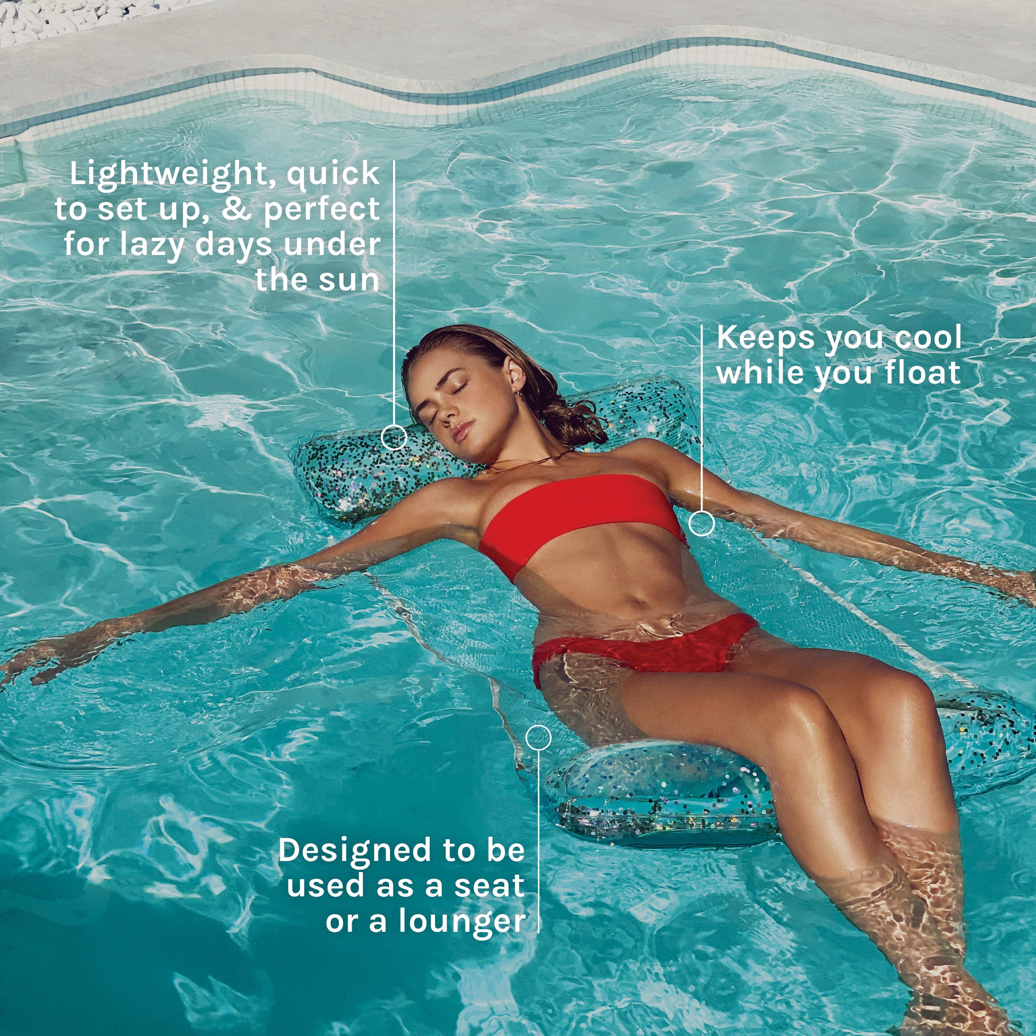 Gonflez vos souvenirs d'été avec nos célèbres flotteurs Insta. Notre hamac avec son support de corps en filet attaché à deux oreillers flottants vous plonge instantanément dans la zone de détente. Les confettis scintillants aident à rendre chaque moment de détente au soleil doré.