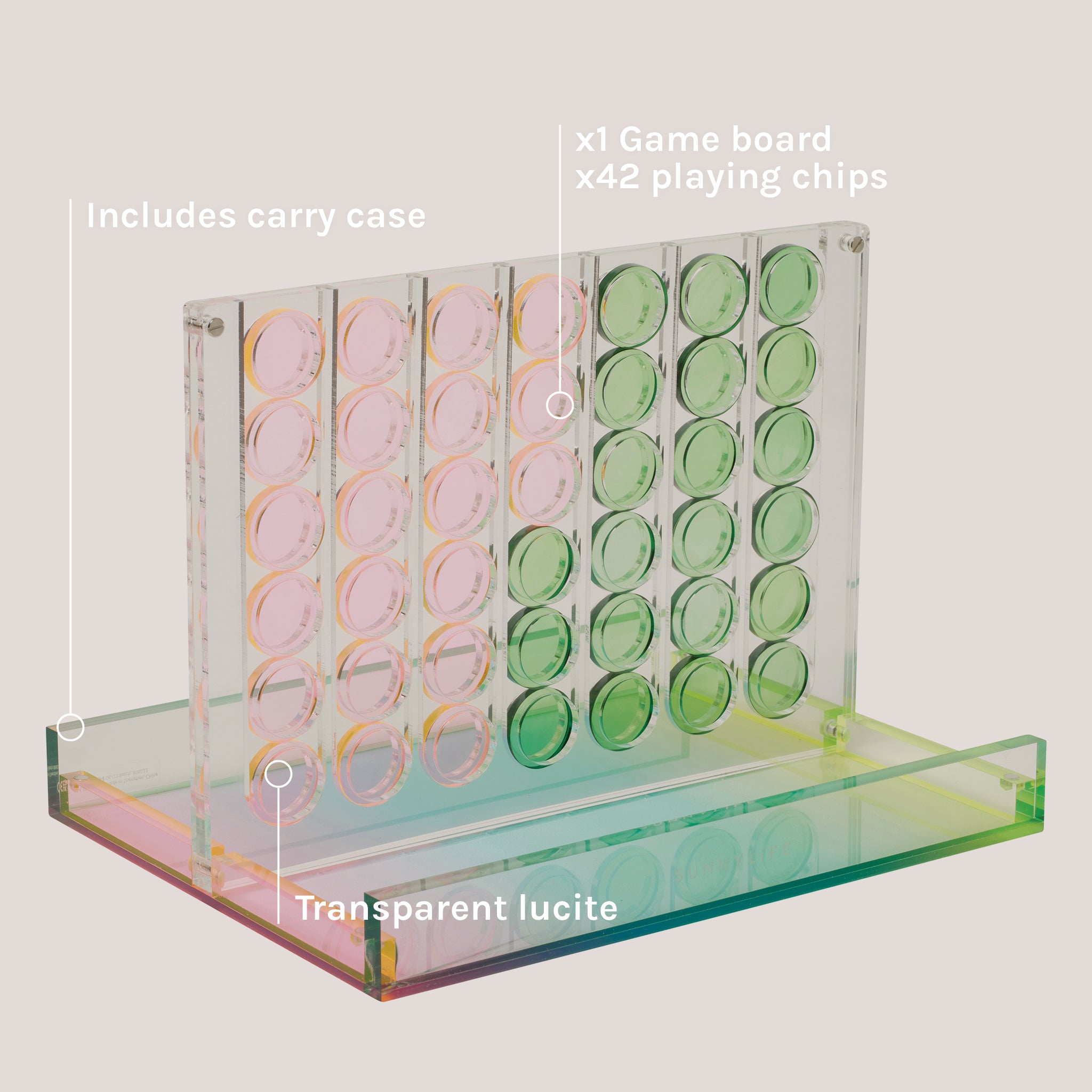 Give yourself a competitive edge with this luxurious rendition of a popular classic. Our stunningly transparent Lucite game sets are a must-have for any lover of retro style and kaleidoscopic colour, designed to be just as beautiful out on display as during a game. With two-toned playing chips and a rainbow, ombre base, the Sherbert 4-in-a-Row set will bring a sophisticated pop of colour to any home. Plus, the game board transforms into its own lucite display case, perfect for easy storage.