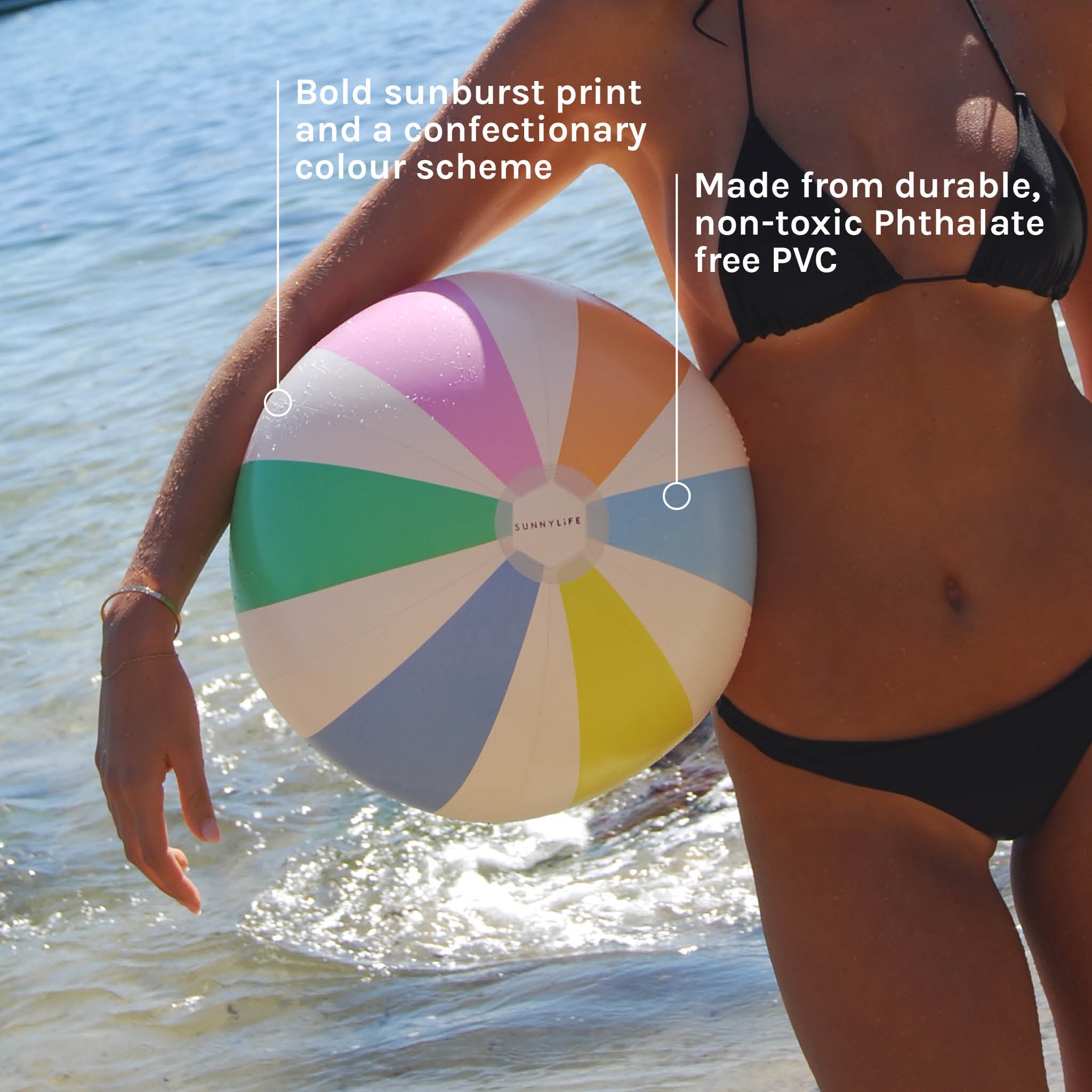 This gelato-inspired beach ball features a bold sunburst print and is made from durable, non-toxic Phthalate-free PVC perfect for playful days in the sun.